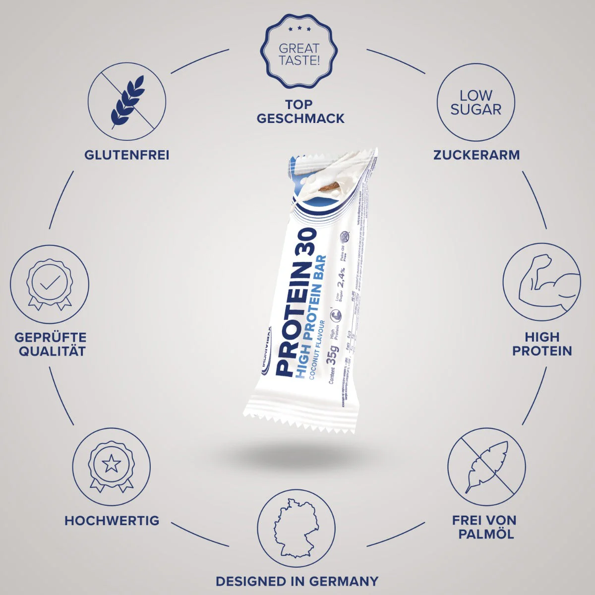 Unser Eiweißriegel Protein 30 macht auch optisch einiges her: Eine cremige Proteinschicht umhüllt von einem schokoladigen Kakaoüberzug! Geschmacklich ist dieses Zusammenspiel ein wahrer Traum. Damit du genügend geschmackliche Abwechslung erhältst, haben wir einige verschiedene Geschmacksrichtungen für dich kreiert, z. B. Schokolade, Banane, Kokosnuss und Cookies & Cream. Probiere dich durch unser Protein 30 Sortiment und finde heraus, welcher Flavour dein Favorit ist!