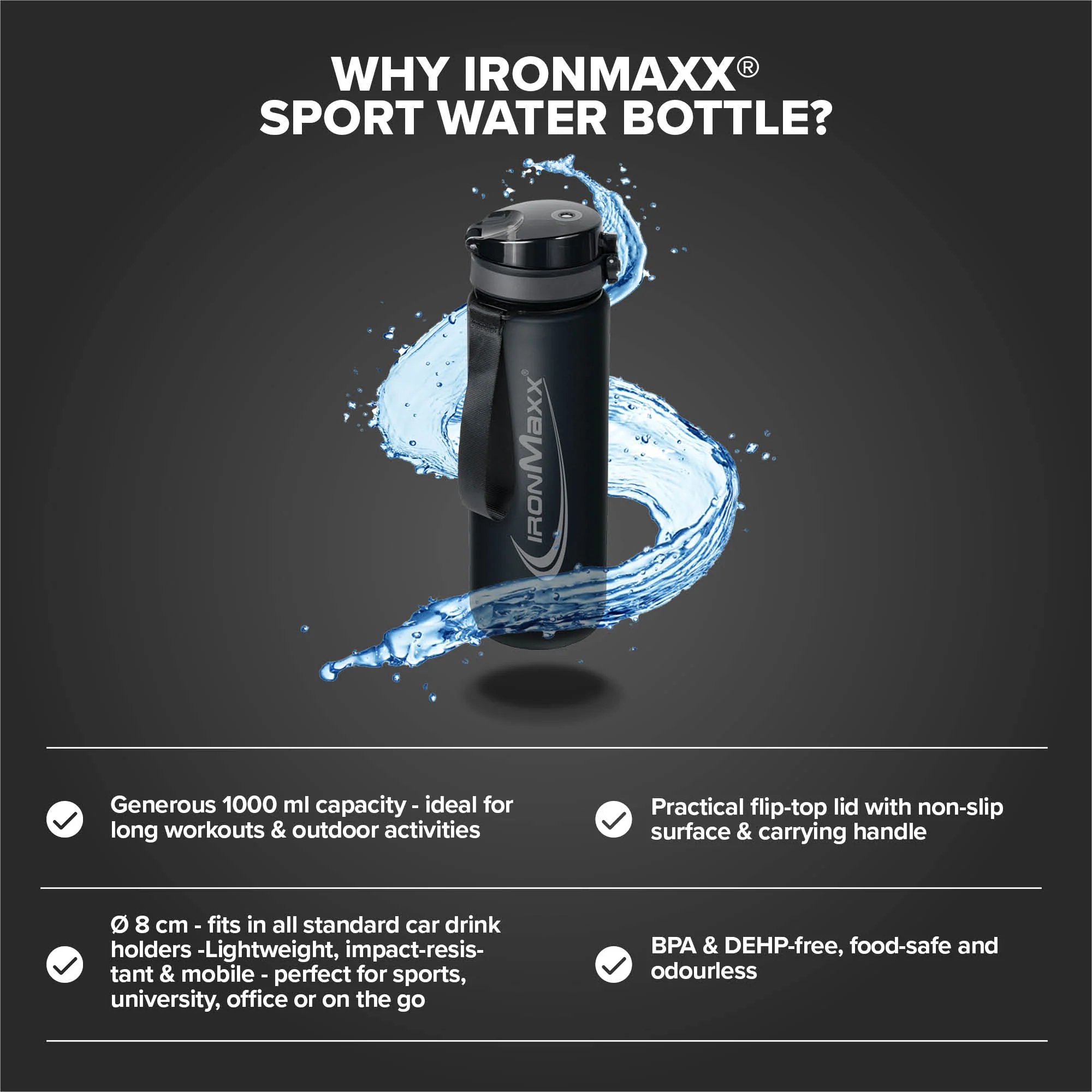 Die IronMaxx® Sport Water Bottle mit 1000?ml Fassungsvermögen ist der ideale Begleiter für Sport, Freizeit und Alltag. Dank des auslaufsicheren Schraubverschlusses eignet sich die Flasche perfekt für unterwegs – ob im Gym, auf Wanderungen oder im Büro.